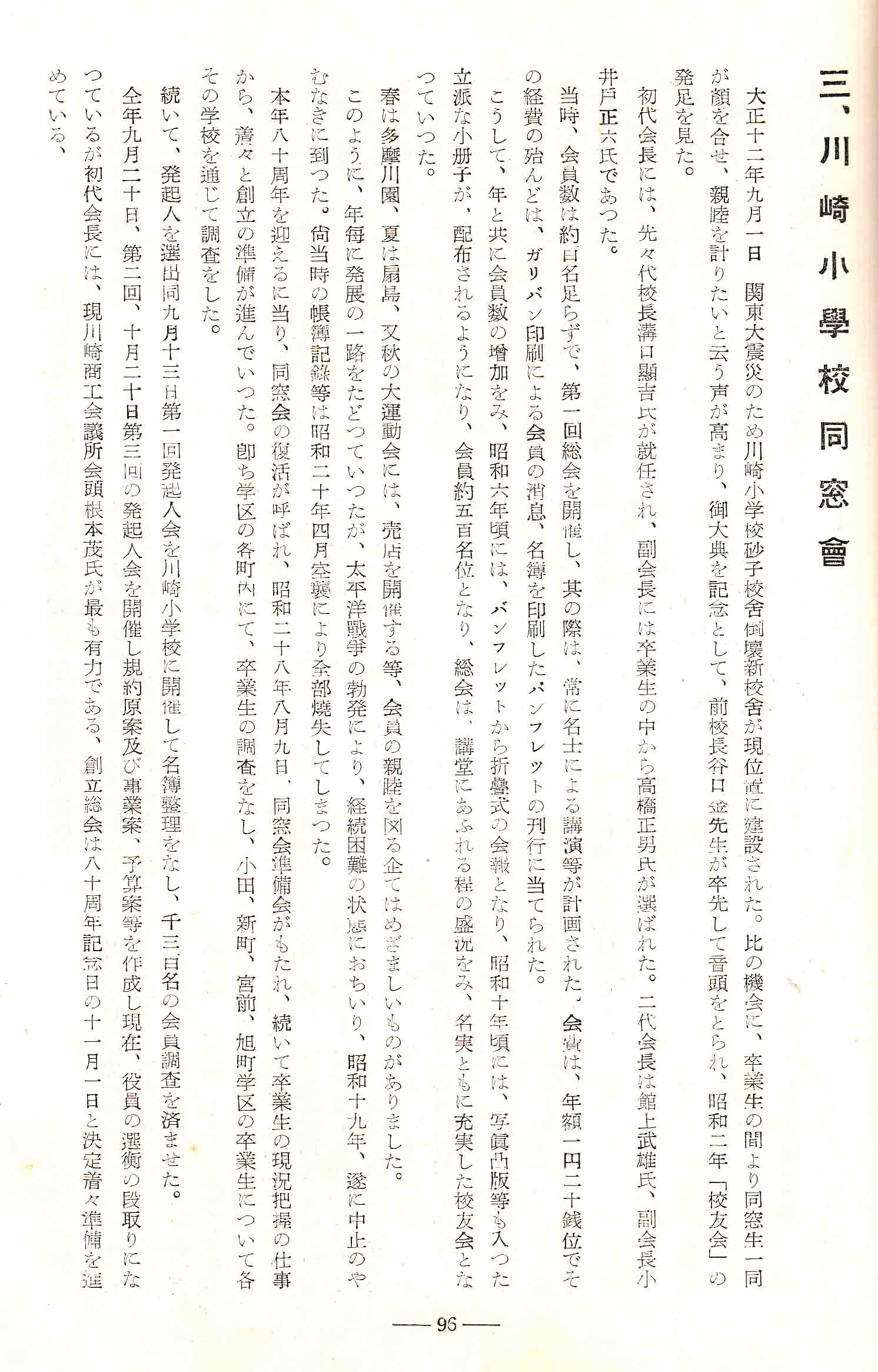 | 大正十二年九月一日 関東大震災のため川崎小学佼砂子校舎倒壊新校舎が原位置に建設された。比の機会に、卒業生の間より同窓生一同が顔を合せ、親睦を計りたいと云う声が高まり、御大典を記念として、前校長谷口金先生が卒先して音頭をとられ昭和二年「校友会」の発足を見た。 初代会長には、先々代校長溝口顕吉氏が就任され、副会長には卒業生の中から高橋正男氏が選ばれた。二代会長は館上武雄、副会長小井戸正六氏であった。 当時、会員数に約百名足らずで、第一回総会を開催し、其の際は、常に名士による講演等が計画された。会費は、年額一円二十銭位でその経費の殆んどば、ガリバン印刷による会員の消息、名簿を印刷したパンフレットの刊行に当てられた。 こうして、年と共に会員数の増加をみ、昭和六年頃には、バンフレットから折疊式の会報となり、昭和十年頃には写真凸版等も入つた立派な小冊子が、配布されるようになり、会員約五百名位となり、総会は講堂にあふれる程の盛況をみ、名実ともに充実した校友会とな っていった。 春は多摩川園、夏に扇島、又秋の大運動会には、売店を開催する等、会員の親睦を図る企てにめざましいものがありました。 このように、年毎に発展の一路をたどつていつたが、太平洋戦争の勃発により、経続困難の状態におちいり、昭和十九年、遂に中止のやむなきに到った。尚当時の帳簿記録等は昭和二十年四月空襲により全部焼失してしまった。 本年八十周年を迎えるに当り、同窓会の復活が呼ばれ、昭和二十八年八月九日、同窓会準備会がもたれ 、続いて卒業生の現況把握の仕事から、着々と創立の準固が進んでいった。即ち学区の各町内にて、卒業生の調査をなし、小田、新町、宮前、旭町学区の卒業生について各その学校を通じて調査をした。 続いて、発起人を選出同九月十三日第一回発起人会を川崎小学校に開催し名簿整理をなし、千三百名の会員調査を済ました。 仝年九月二十日、第二回、十月二十日第三回の発起人会を開催し規約原案及び事業案、予算案等を作成し現在、役員選衡の段取りになつているが初代会長には、現川崎商工会議所会頭根本茂氏が最も有力である、創立総会は八十周年記念日の十一月一日と決定着々準備を進めている。 |